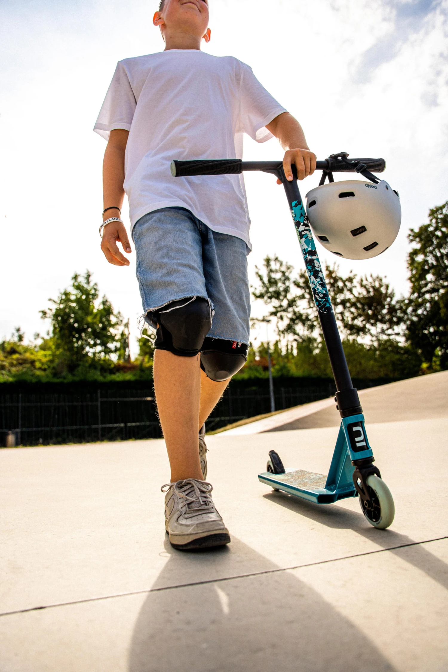 You should always wear protective equipment (helmet, knee pads and elbow pads) when scootering.