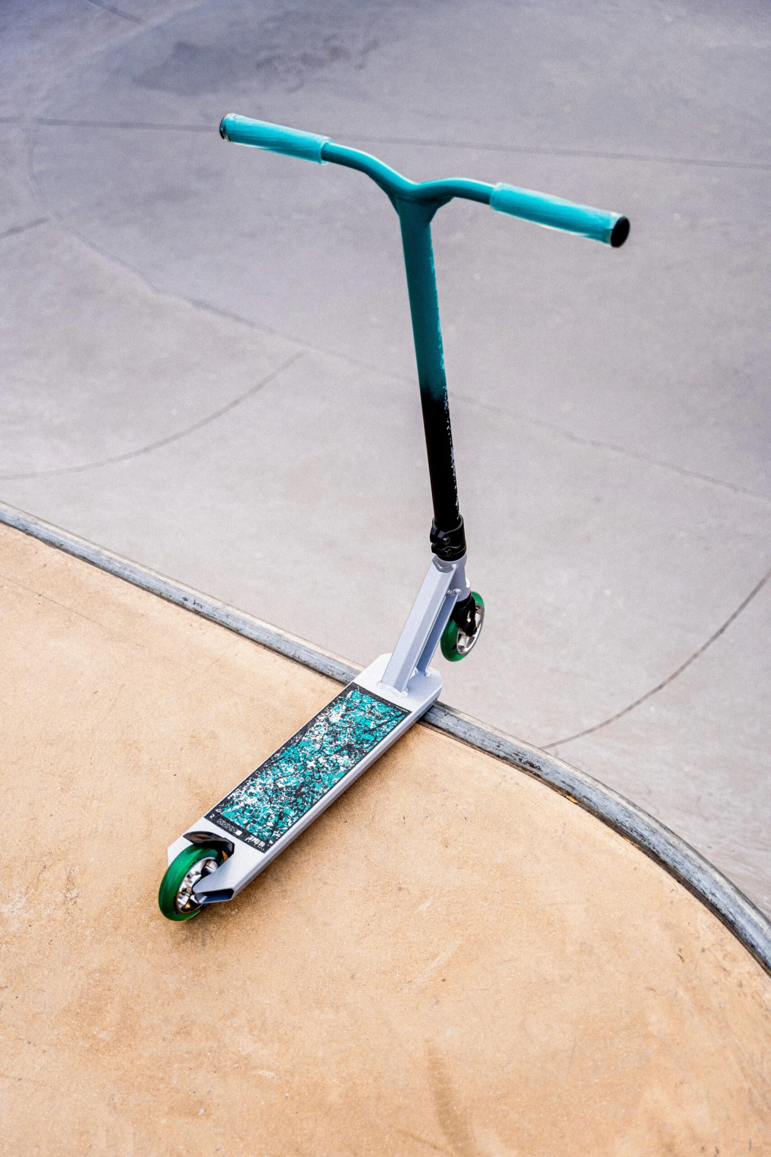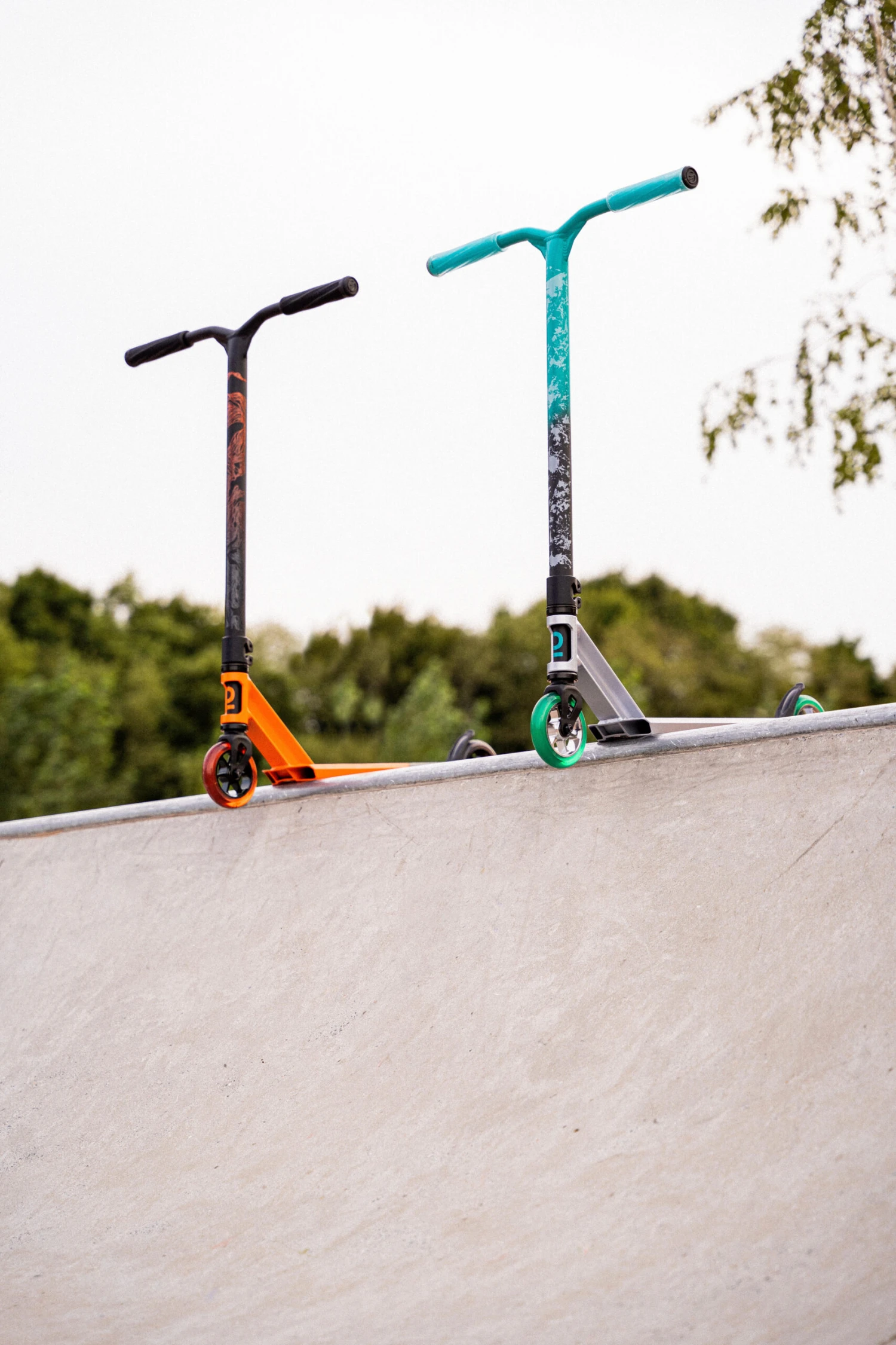 A freestyle scooter has wider handlebars and smaller wheels (making it easier to handle). Its weight is also different (it is lighter) and it is more manoeuvrable. Since the aim is to do tricks, the handlebars can do a full turn, for example.
