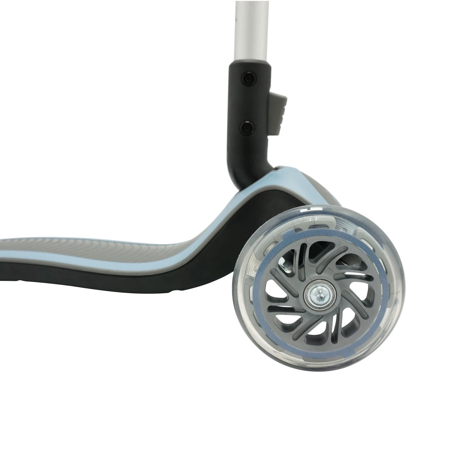 Two 121 mm (polyurethane) front wheels, and one 80 mm transparent cast PU rear wheel (high quality).