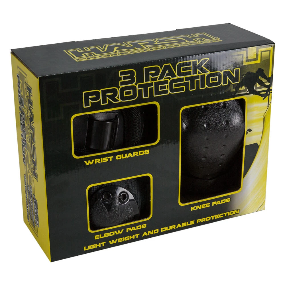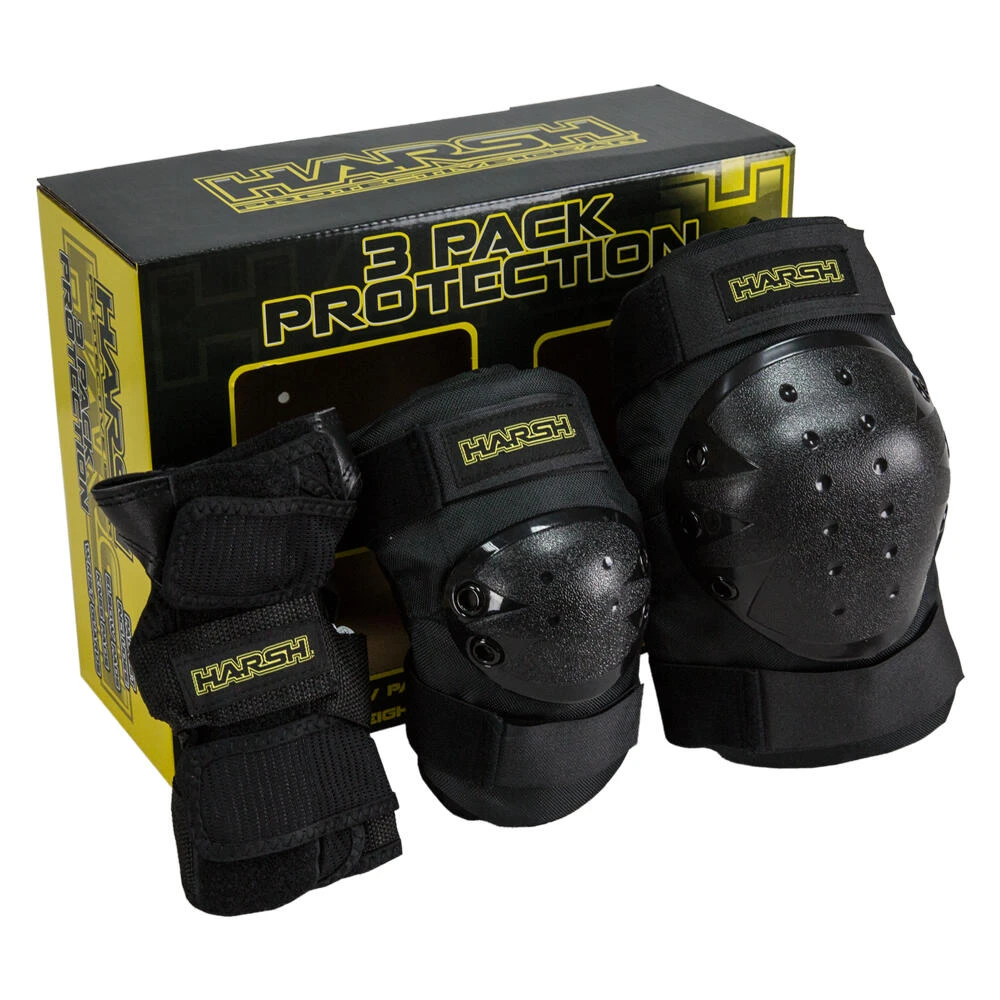 The all new Harsh Protection 3 Pack Combo Set features tough, impact resistant, outer hard shells combined with Velcro fastenings to eliminate movement during use make this superior knee, elbow and wrist combo pad set an excellent choice and they offer support and protection where and when it counts.