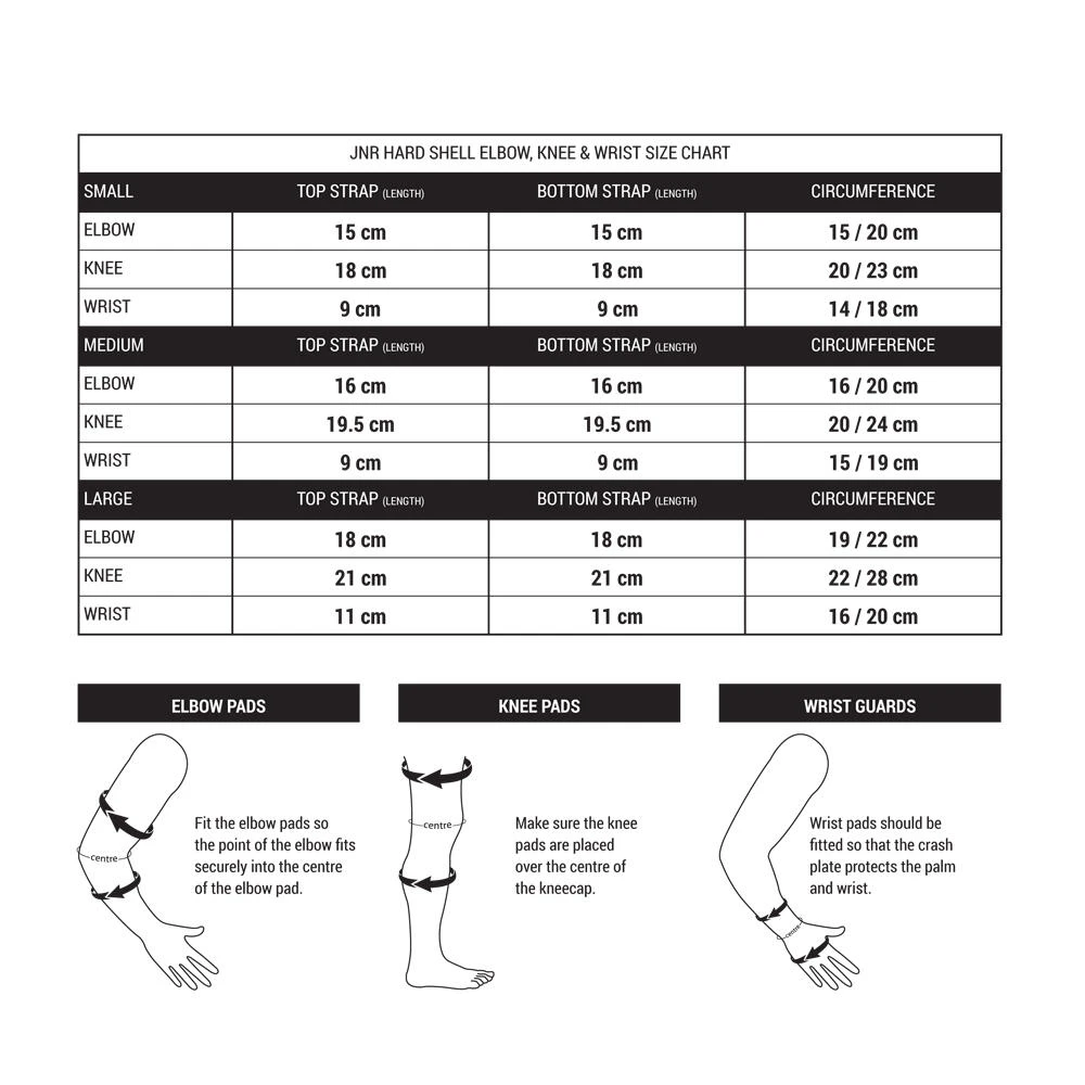 - Hard shell elbow and knee caps and wrist guards with tough ABS splints top and bottom