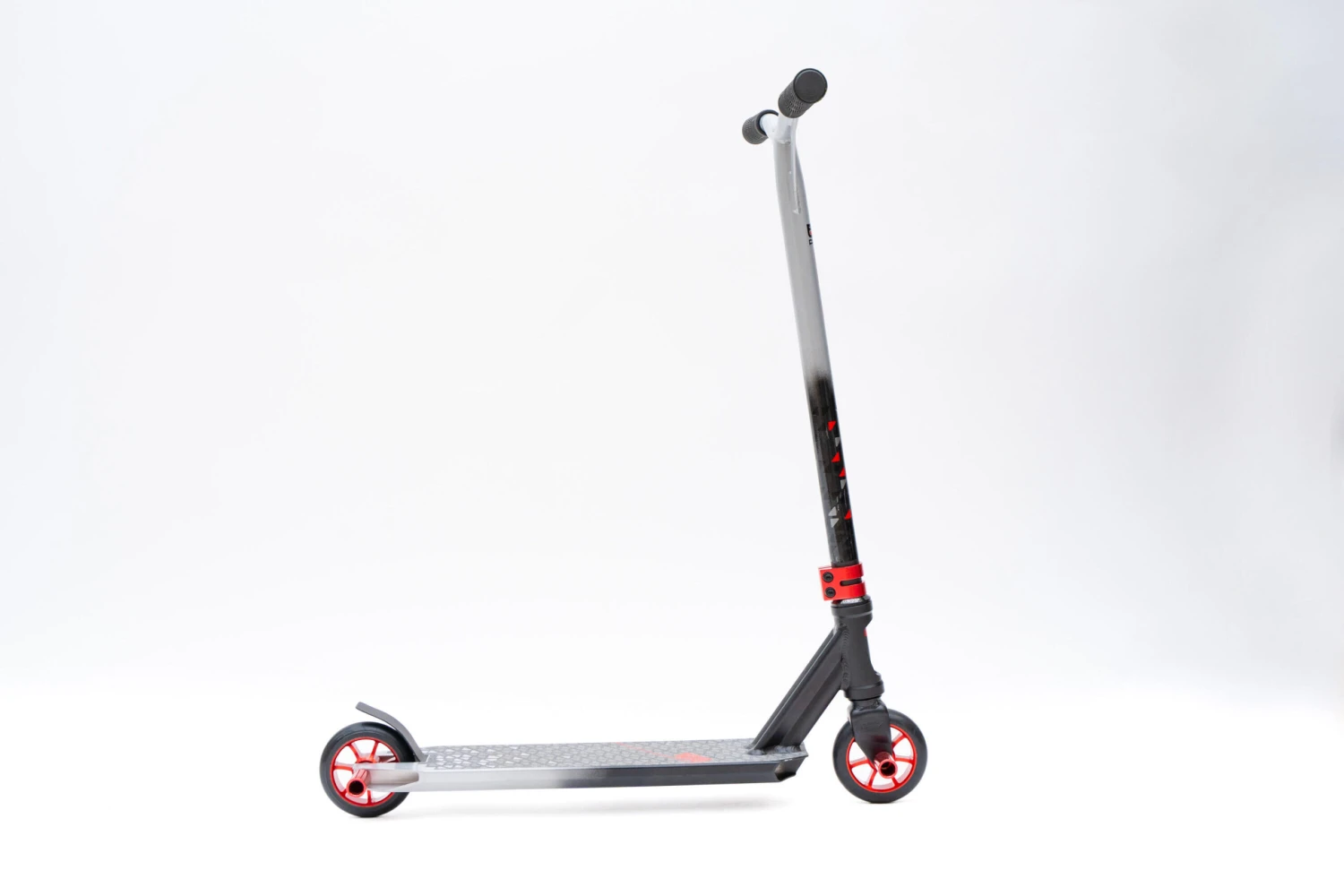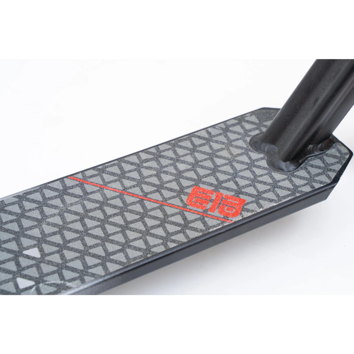E13 Pro Elite Inline Stunt Scooter features a black deck with a black and grey handlebar stem and red wheels. 110mm Wheels + ABEC 9 Bearings.