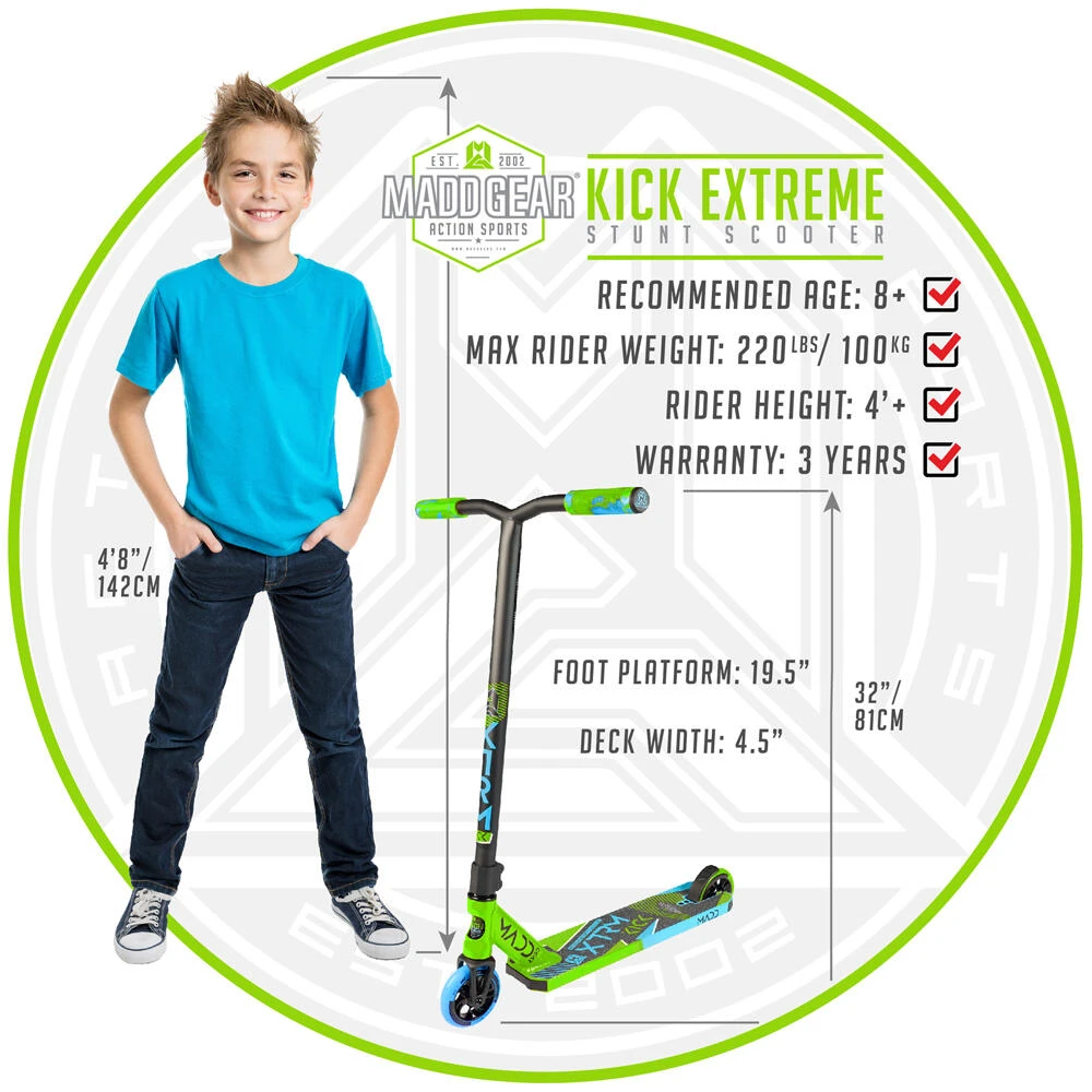 The Madd Gear Kick Extreme V5 Stunt Scooter has been refined again, producing a dialed complete that strikes the crucial balance between performance and durability. Designed for riders over 8 years.