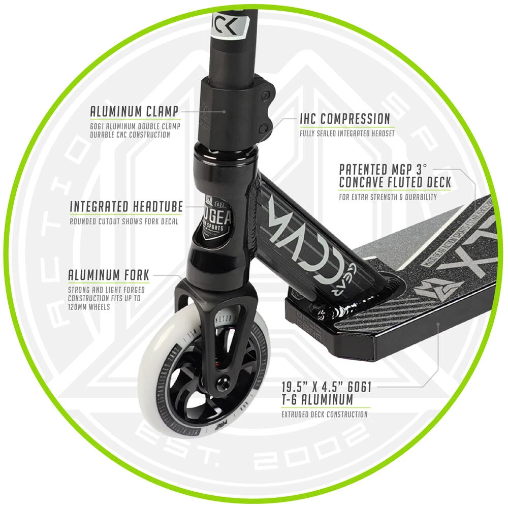 This full size complete is designed for riders 8 years and up and is backed by Madd Gear’s reputation for quality and durability. Dialed straight out of the box and uncompromising on build quality, the Madd Gear Kick Extreme V5 is easy to trick and is ready to take your progression to the next level. Each component of the Madd Gear Kick Extreme Stunt Scooter has been hand selected to produce a complete scooter that can stand up to the demands of today’s up and coming pro riders in a package that is easy to trick and promotes fast progression! Weighing just 3.22kg / 7.1lbs, the Madd Gear Kick Extreme is the scooter for you.