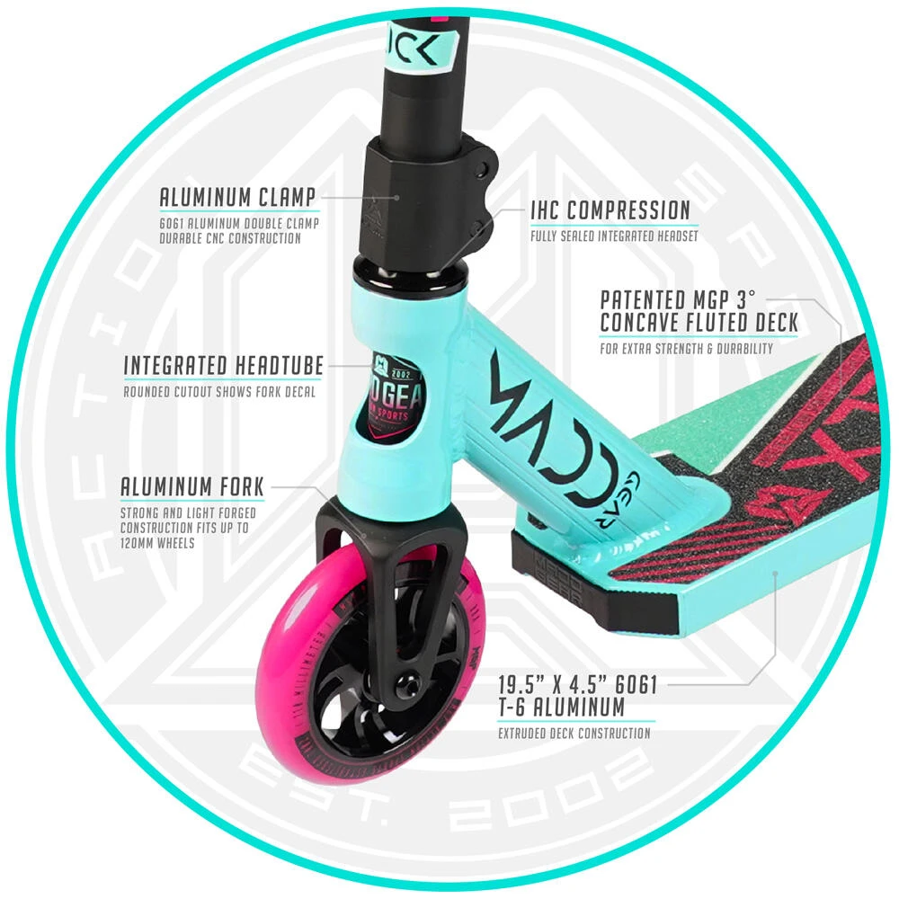 - Deck: 4.5” Wide x 19.5” Long Madd Gear Kick Series Aviation-Grade 6061 Aluminium T4 & T6 Heat Treated and Integrated Rounded Box Deck with Integrated Downtube and Headtube Cutout
