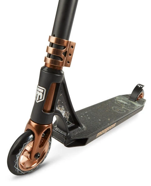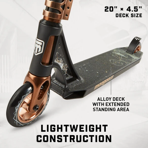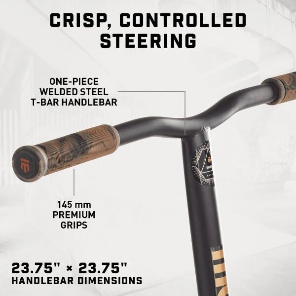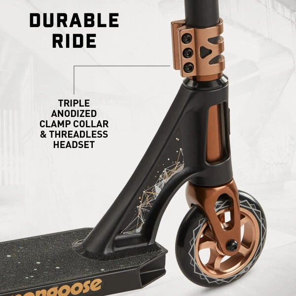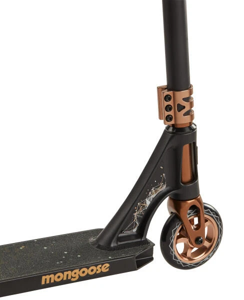 Mongoose Rise 110 Expert Freestyle Stunt Kick Scooter, Featuring Lightweight Alloy Deck with Full-Coverage Max Grip and Bike-Style Handlebars, 110mm Alloy Wheels, Black/Tan