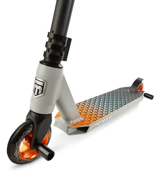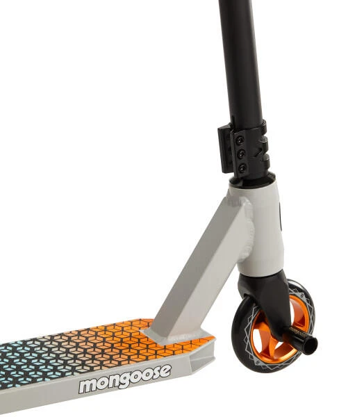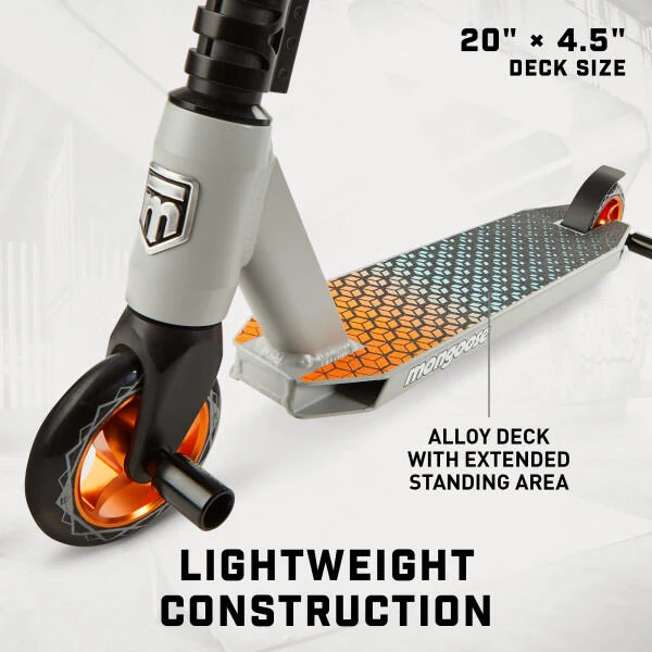 Showcase your skills at the skatepark with the Rise 110 Elite Freestyle Scooter by Mongoose. The Rise is loaded with outstanding features, including a lightweight alloy deck with extended standing area, with front and rear alloy pegs for pro-style park performance. The full-coverage MaxGrip™ on the alloy deck and steel brake combine with 110 mm high impact alloy wheels and durable ABEC-7 bearings to provide smooth non-slip riding. The one-piece welded steel T-bar handlebar with bike-style grips gives you the perfect combination of durability and comfort. Plus, the triple anodized CNC clamp collar, internal sealed threadless headset, and alloy fork provides precise, crisp steering wherever you go. This scooter can accommodate a wide variety of riders, as the heavy-duty frame supports children ages 8+, up to 220 lbs. Upgrade your scooter game with the Rise 110 Elite Freestyle Scooter.