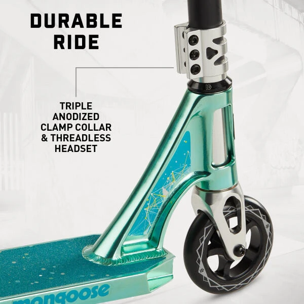 Showcase your skills at the skatepark with the Rise 110 Expert Freestyle Scooter by Mongoose. The Rise is loaded with outstanding features, including a lightweight alloy deck with extended standing area for pro-style scooter performance. The full-coverage MaxGrip™ on the alloy deck and steel brake combine with 110 mm high impact alloy wheels and durable ABEC-9 bearings to provide smooth non-slip riding. The one-piece welded steel T-bar handlebar with bike-style grips gives you the perfect combination of durability and comfort. Plus, the triple anodized CNC clamp collar, internal sealed threadless headset, and CNC alloy fork provides precise, crisp steering wherever you go. This scooter can accommodate a wide variety of riders, as the heavy-duty frame supports children ages 8+, up to 220 lbs. Upgrade your scooter game with the Rise 110 Expert Freestyle Scooter.
