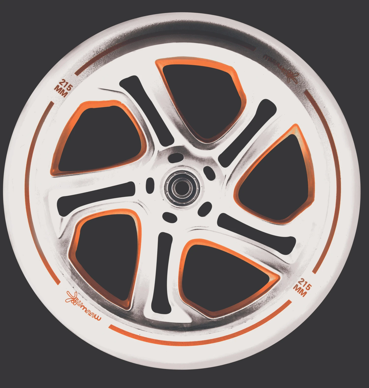215 mm cast PU wheels with 2-coloured rim, High Rebound, 82A, ABEC 7 ball bearings
