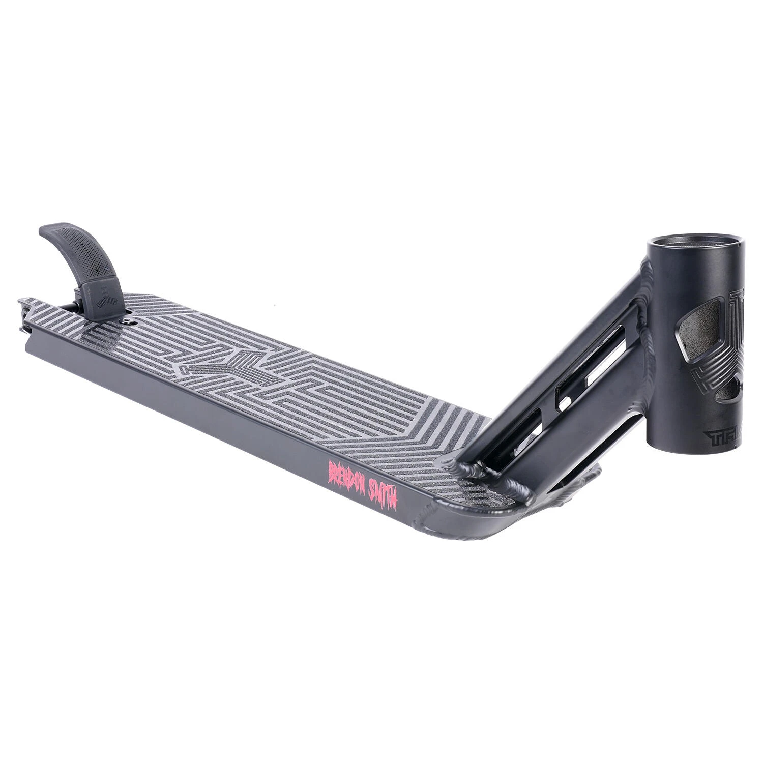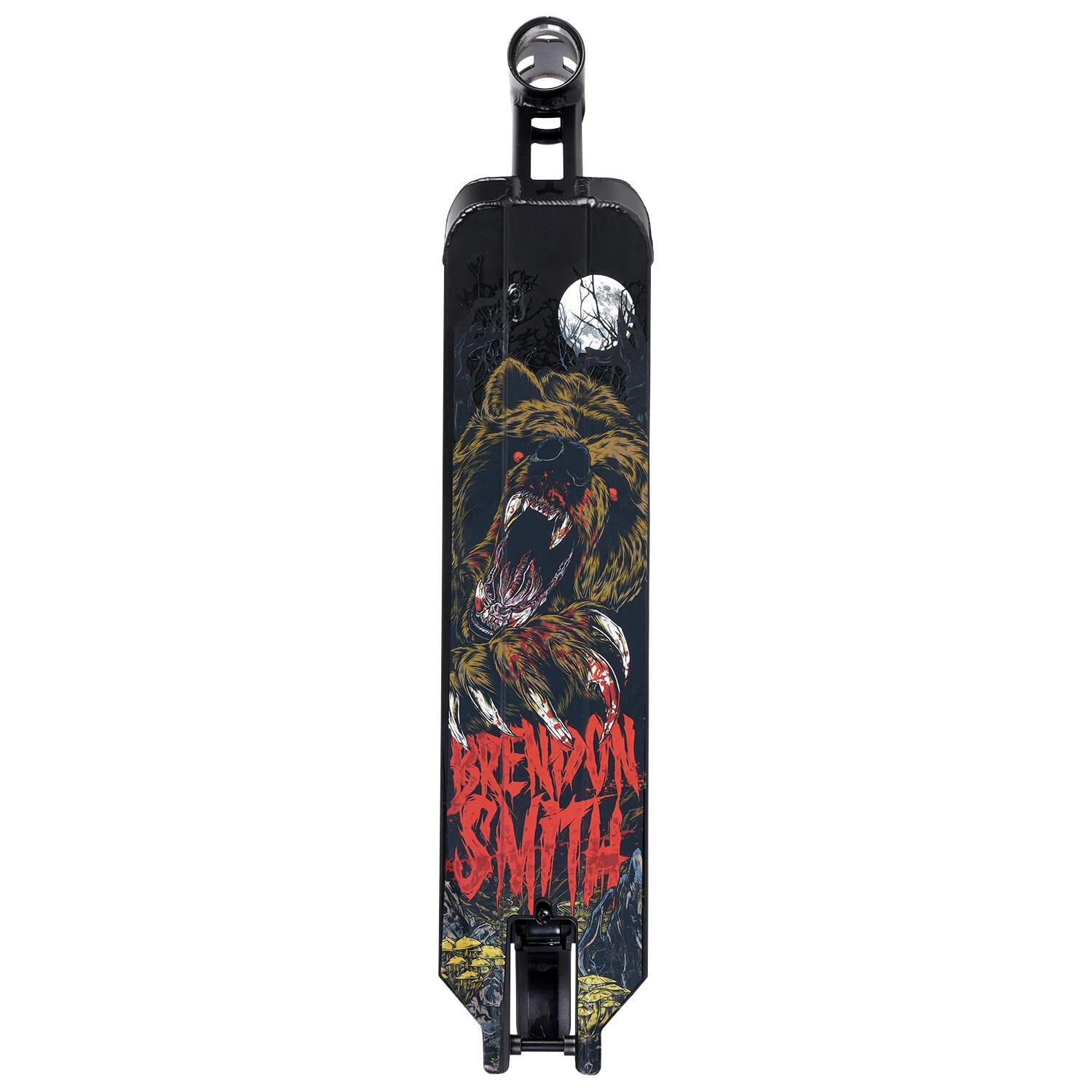 We all know what Brendon is capable of on a scooter, so we wanted to develop a product that allows him to do what he does without impediment. A lightweight, perfectly balanced deck made from only the best materials available. Complete with his full length hand drawn artwork from a world renown artist with details previously unseen in the scooter industry. The back end features our Mini Gridlock system that eliminates the use of spacers and has been designed to fit pegs with no issues.