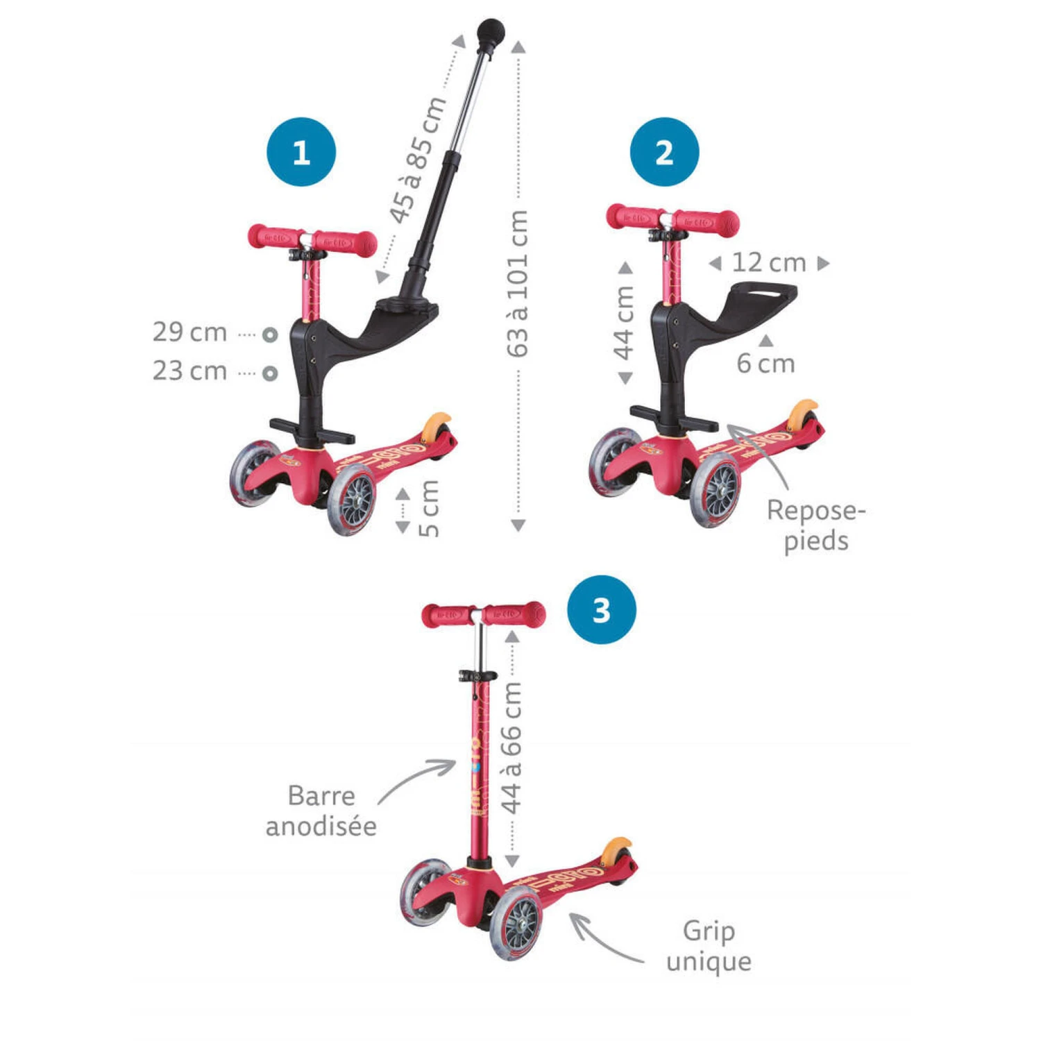 Our Mini Micro 3in1 Push Along is a scooter with a trio of talents. Ride-on scooter with adjustable seat and removable parent steering handle from 12 months. Lean-to-steer toddler scooter with ultra-manoeuvrable parent handle. The adjustable parent handle fits into the back of the seat with a disc to secure it from underneath.