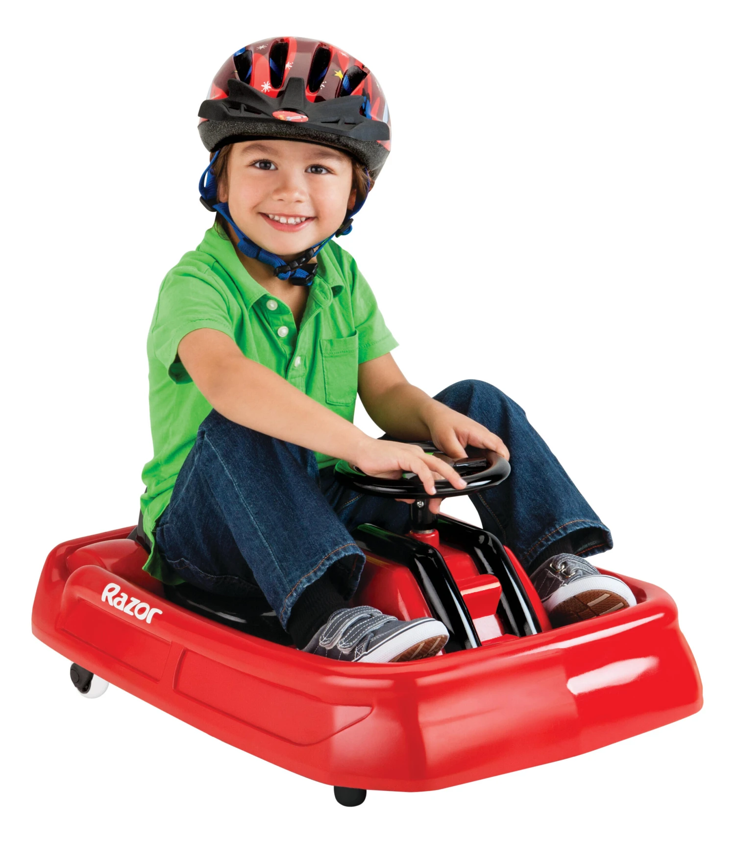 Check out the Lil’Crazy, for ages 3 and up. Razor’s mini version of the wildly popular CrazyCart has simplified controls and a max speed of 2 mph to provide a fun introduction to the world of spins and drifts.Features: Speeds up to 2 mph, up to 40 minutes run time on continuous use, in-wheel hub electric motor, foot throttle, 6V rechargeable battery. Max rider weight: 20kg. For ages 3+.