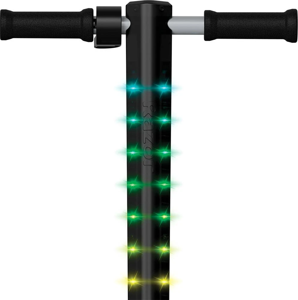 Powered by Razor’s Power Core technology, the Power Core E90 Lightshow electric scooter reaches impressive speeds up to 10 miles per hour (16 km/h). With a thumb-activated throttle, rear-fender brake, and the newly designed all-steel frame with multi-colour LED lights, it’s the most solid ride for kids to increase their fun footprint. Equipped with a 12V rechargeable battery that delivers up to 40 minutes of continuous run time for riders age 8+ and up to 120 lbs (54 kg), this stylish electric scooter is a safe, solid, and fun ride!