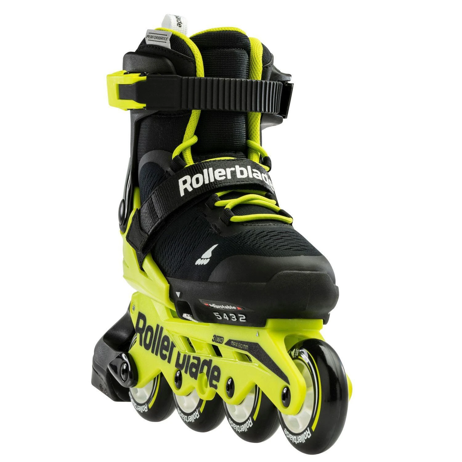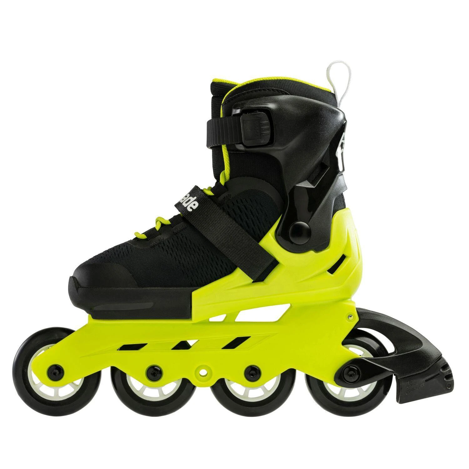 Rollerblade makes the best adjustable inline skates for kids. Microblade skates are adjustable 4 full sizes to grow with children’s feet and have an easy to use adjustment system that works with the push of a button. Easy to read markers in the toe area make aligning the skates to the correct size easy and reliable. The Microblade structure provides better support and and helps improve the stability, balance and control. The models were redesigned with engineered mesh for comfort and breathability and the dual set up of the frames allows skaters to have the option of upgrading to a 3WD set up by simply purchasing larger wheels. Junior Fit liners make the Microblade very comfortable and the wheel/bearing combination is perfect for kids to get started with the right amount of speed. The closure system ensures a secure fit with easy on and off abilities. Having a positive first experience on skates will increase the chances kids will continue to skate, stay active and improve their fitness abilities while having fun and creating a life long activity. Brake is on the skate.