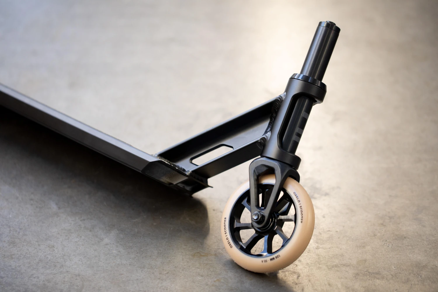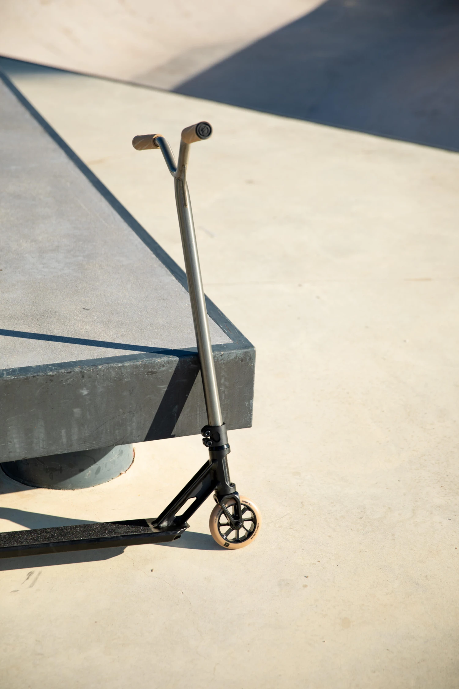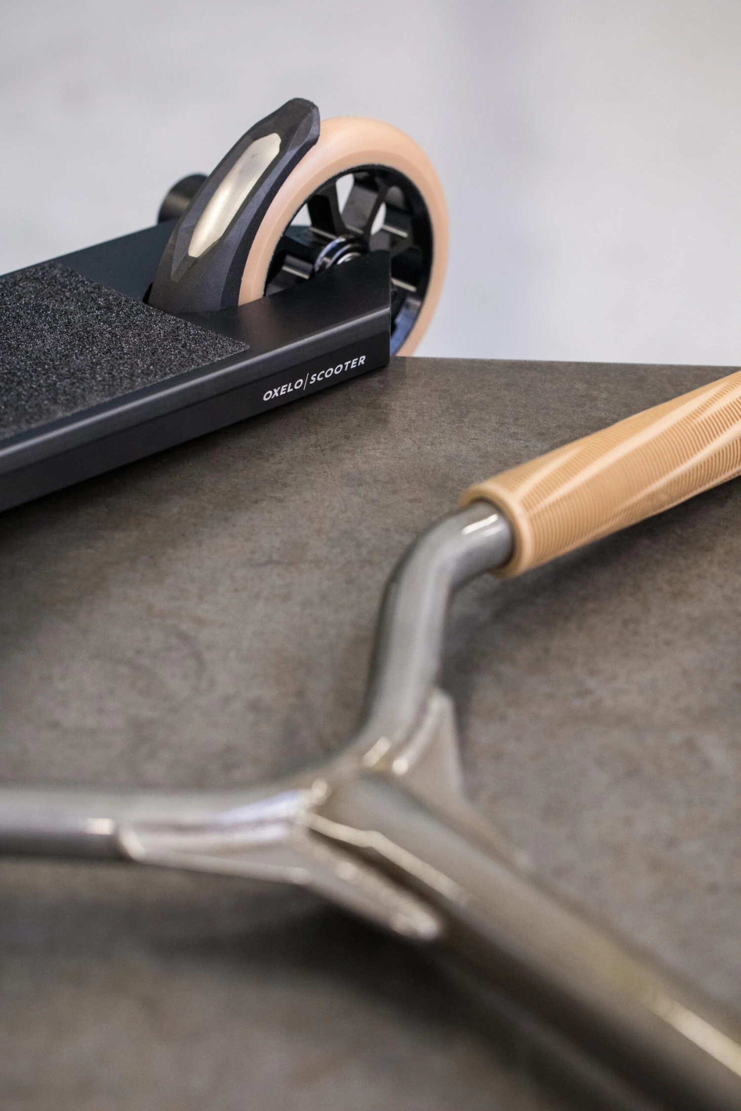 The fork on this freestyle scooter is unique in that it’s made from forged aluminium (the aluminium has been pressed several times to make it denser and more durable).