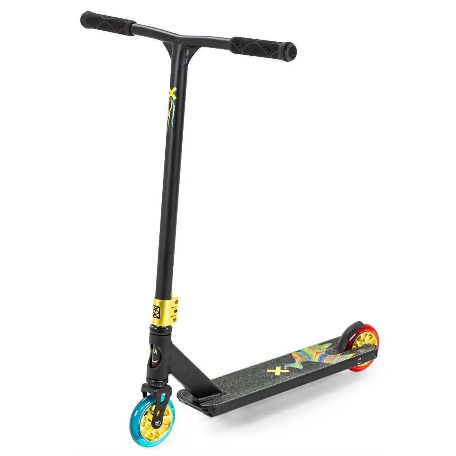 The Slamm X-Edition celebrates 10 years of Slamm Scooters, bringing a vibrant new model with an explosive colourway and specs. Featuring a T6 heat treated 4.5” x 19.5” deck and 110mm V-Ten Ghost Wheels with two different colours of semi-transparent PU, highlighted by the anodised gold alloy cores. Subtle hints to the 10 year anniversary feature in blacked out decals on the back of the bar and a cut out X section of the grip tape. The X-Edition includes Slamm’s exclusive Coffin connector, front and rear deck blocks along with impact resistant bar ends. This celebratory X-Edition model is everything you want on a stunt scooter.