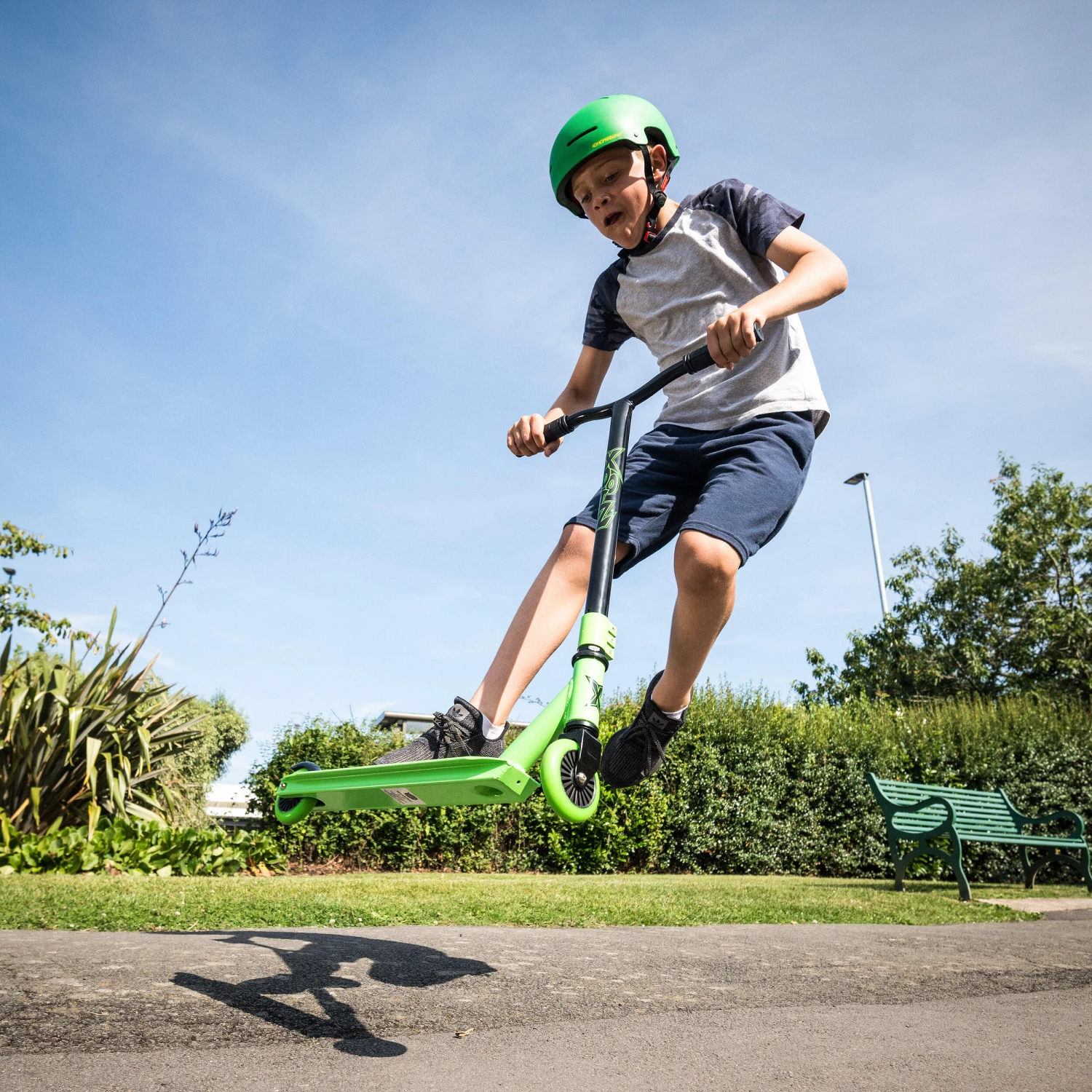 The Xootz Y Bar Complete Stunt Scooter will have kids itching to get down to the skate park or out on the street. With its one piece Y-bars you’ll be doing a whole load of scooter tricks and stunts in no time including tail whips, bar spins and bunny hops. This complete stunt scooter, designed specifically for performing stunts and tricks, is made from durable and strong steel and will last no matter what stunts you throw at it. With its ABEC 7 bearings and robust 100mm PVC wheels a smooth ride is guaranteed. The three bolt clamp will keep your bars in place no matter how many bar spins you do. It’s pretty stylish too and will get admiring glances in the skate park, with its bright green and black colourway, fully printed grip tape and bright green wheels. Suitable for age 6+. Maximum recommended user weight: 50kg / 110 lbs.