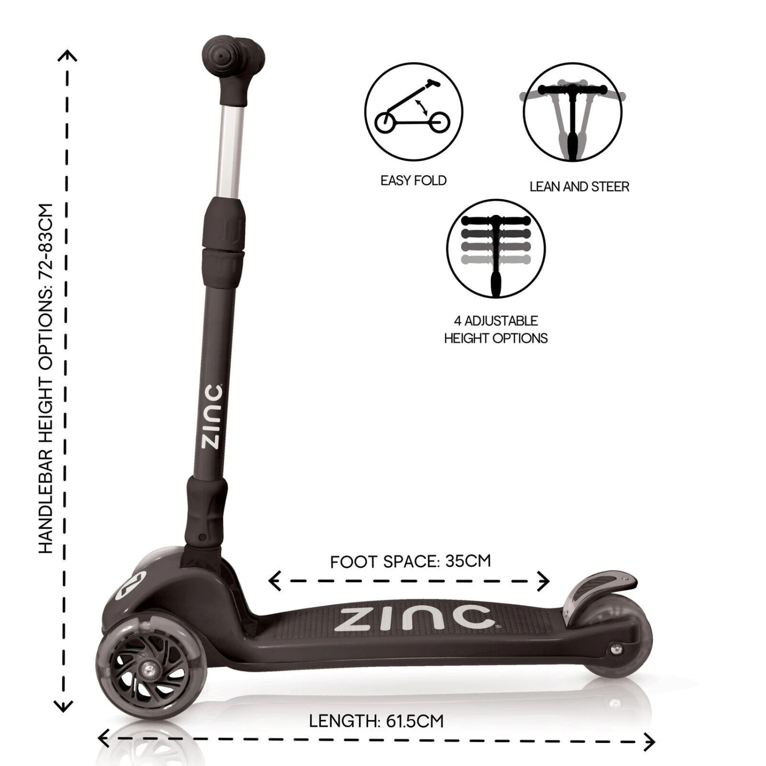 The Zinc three wheeled folding light up T-Motion scooter is ideal for a young child learning to ride. Watch your child have so much fun with the battery free light up wheels! This is the perfect scooter for your child to develop their balance skills with the lean ‘n’ steer controls, as well as two large 120mm front wheels and an 80mm rear wheel. The scooter comes equipped with a robust rear footbrake, designed to bring your child safely to a stop. Your child can continue to have fun and make memories with the scooter as they grow with the 4 adjustable height options of 72, 75.5, 79 and 83cm.